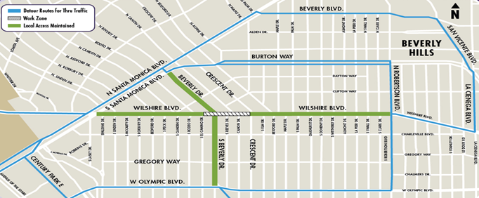 Wilshire Boulevard is fully closed for three weeks between S. Crescent Drive and El Camino Drive to remove deck panels and restore the street. Click here to read more. |
