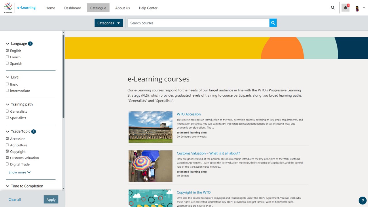 The upgraded WTO e-Learning platform now includes advanced search filters by language, level, topic, and duration.