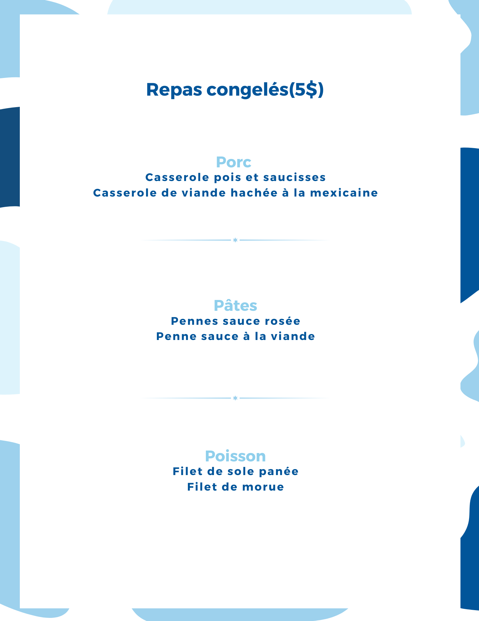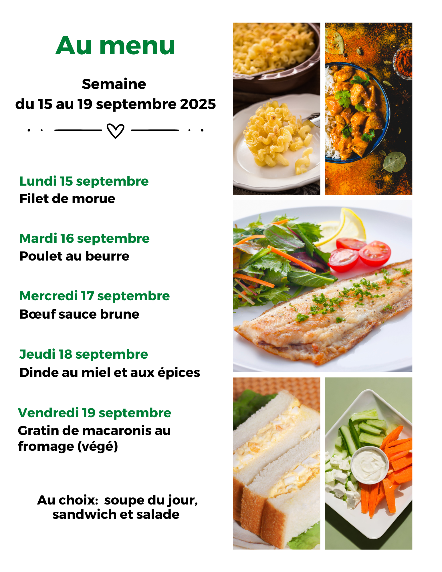 Filet de morue - Poulet au beurre - Bœuf sauce brune - Dinde au miel et aux épices - Gratin de macaronis au fromage (végé) |