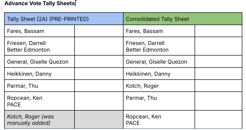 Note: Pre-populated tally sheets were only provided for Advance Vote. Edmonton Elections has verified there were no errors found in any other Advance Vote Tally Sheet.