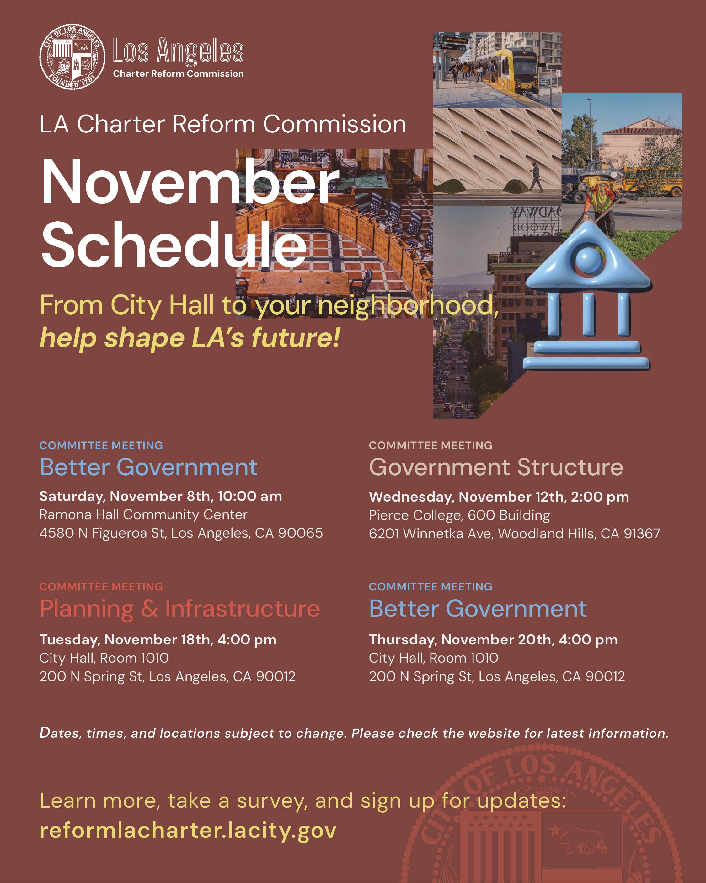 How many City Councilmembers should Los Angeles have? Should the City try ranked choice voting like other cities have done? Are changes needed to our civil service rules? What is the appropriate process to remove and replace a Councilmember who has been indicted or accused of wrongdoing? What are the roles and responsibilities of certain commissions or the neighborhood councils? All these things are defined in the City Charter. As you may know, a Charter Reform Commission has been meeting to review and discuss potential changes to the LA City Charter, with a goal to present amendments to the voters in November 2026. The Commission’s Government Structure Committee will meet in the West Valley on Wednesday, November 12th at 2pm at Pierce College, 600 Building, 6201 Winnetka Ave in Woodland Hills.