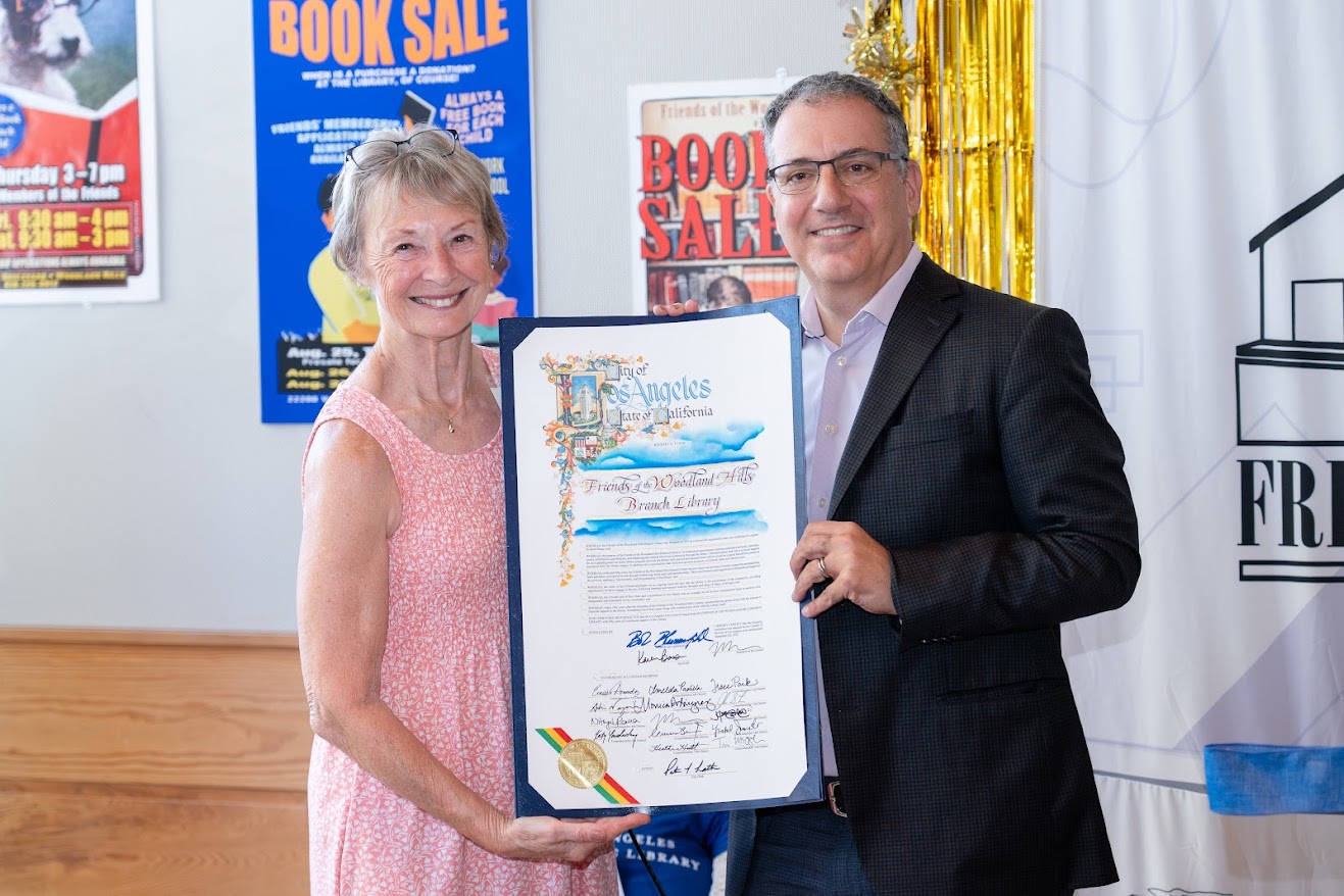 In recognition of the 50th Anniversary of the Friends of the Woodland Hills Library, Councilmember Blumenfield presented a City proclmation to Mary C. Schaffer, President of the Friends of the Woodland Hills Library, in recognition of their decades of service to the community. |
