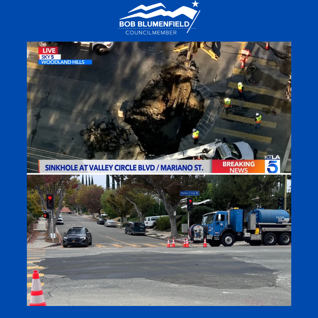 Ongoing repairs are underway following the recent water main break at Valley Circle and Mariano in Woodland Hills. Please take it slow and watch out for workers. Councilmember Blumenfield thanks LADWP and City crews for their quick response and continued efforts to restore the area. |