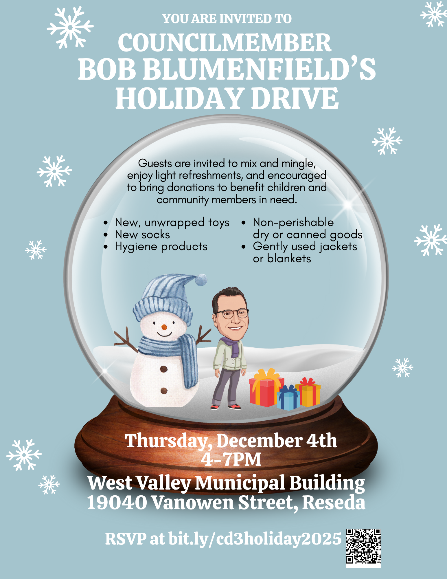 The holidays are around the corner and I hope you can attend my annual holiday party and toy/essentials collection drive happening on Thursday, December 4th from 4-7pm. This year we will be having the party at my District Office in Reseda. It’s always a fun time and a great way to connect or re-connect with friends and neighbors. |