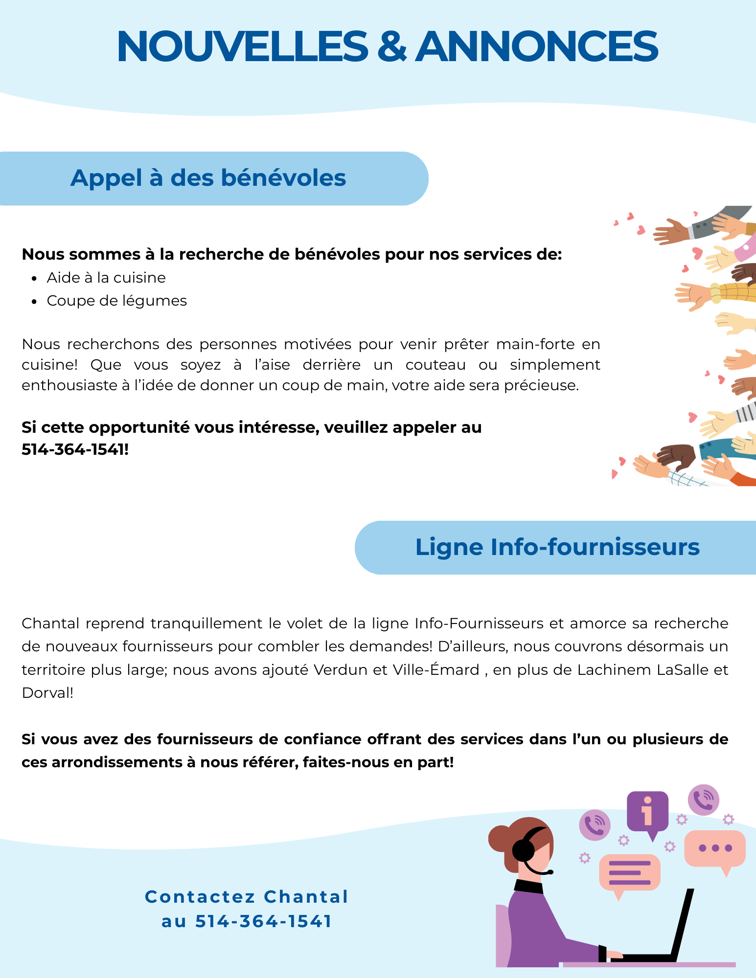 Nouvelles & annonces: appel à des bénévoles et ligne info-fournisseurs |