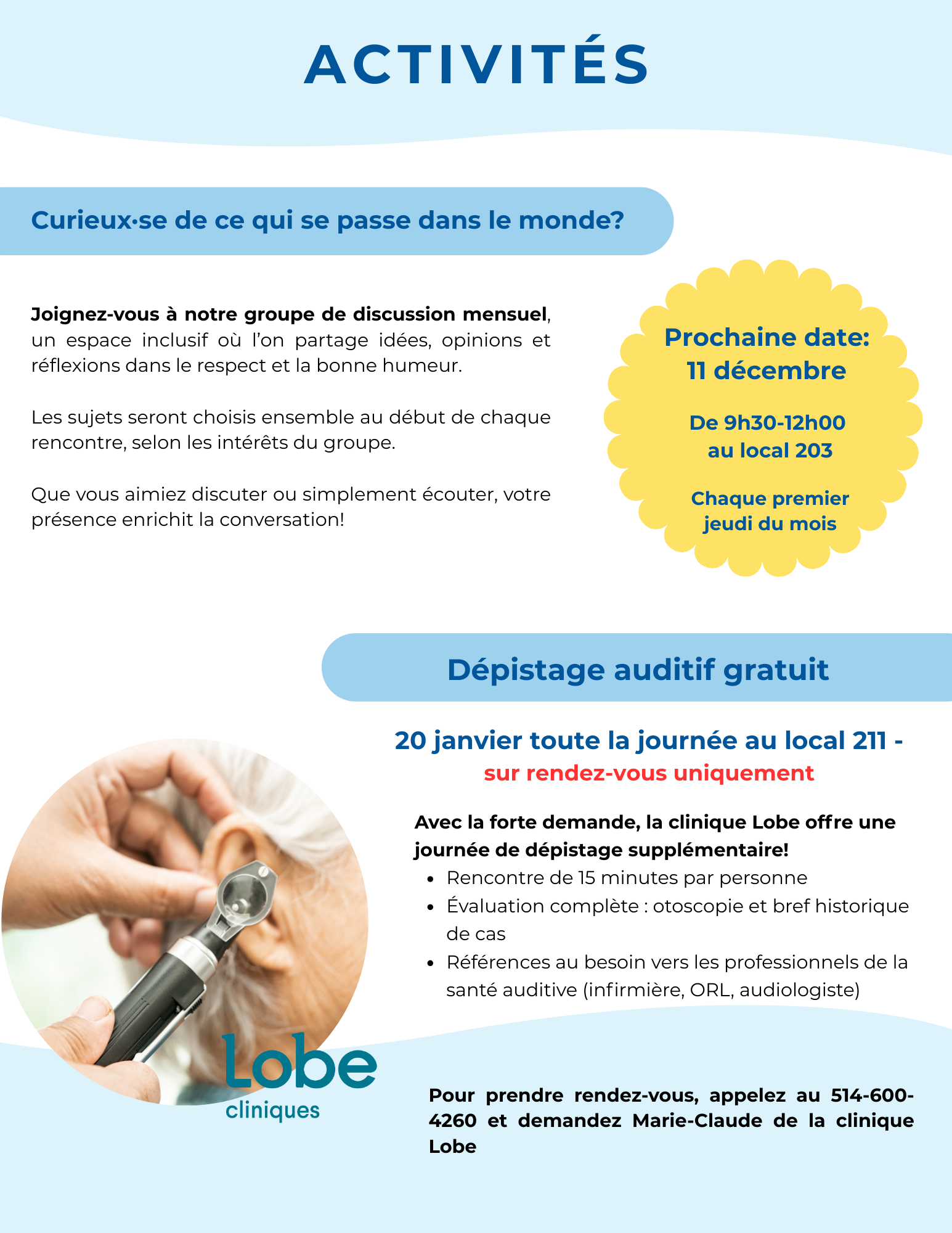 Activités: groupe de discussion sur l'actualité et dépistage auditif |