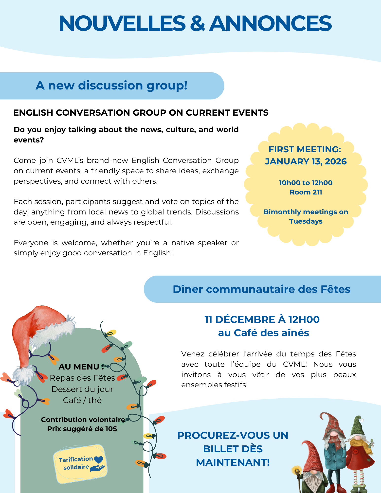 Nouvelles & annonces: english conversation group et dîner communautaire de décembre |