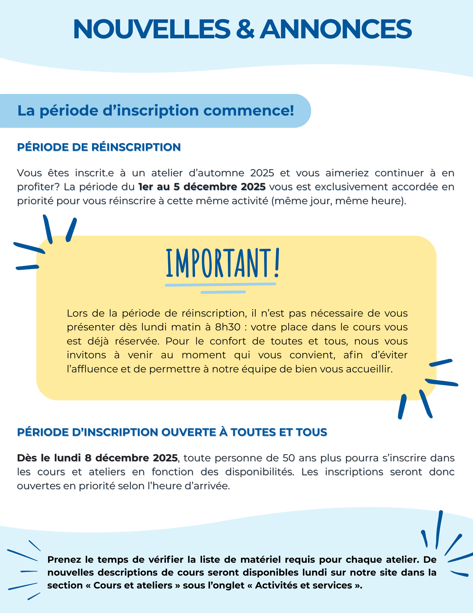 Nouvelles & annonces: la période d'inscription commence! |
