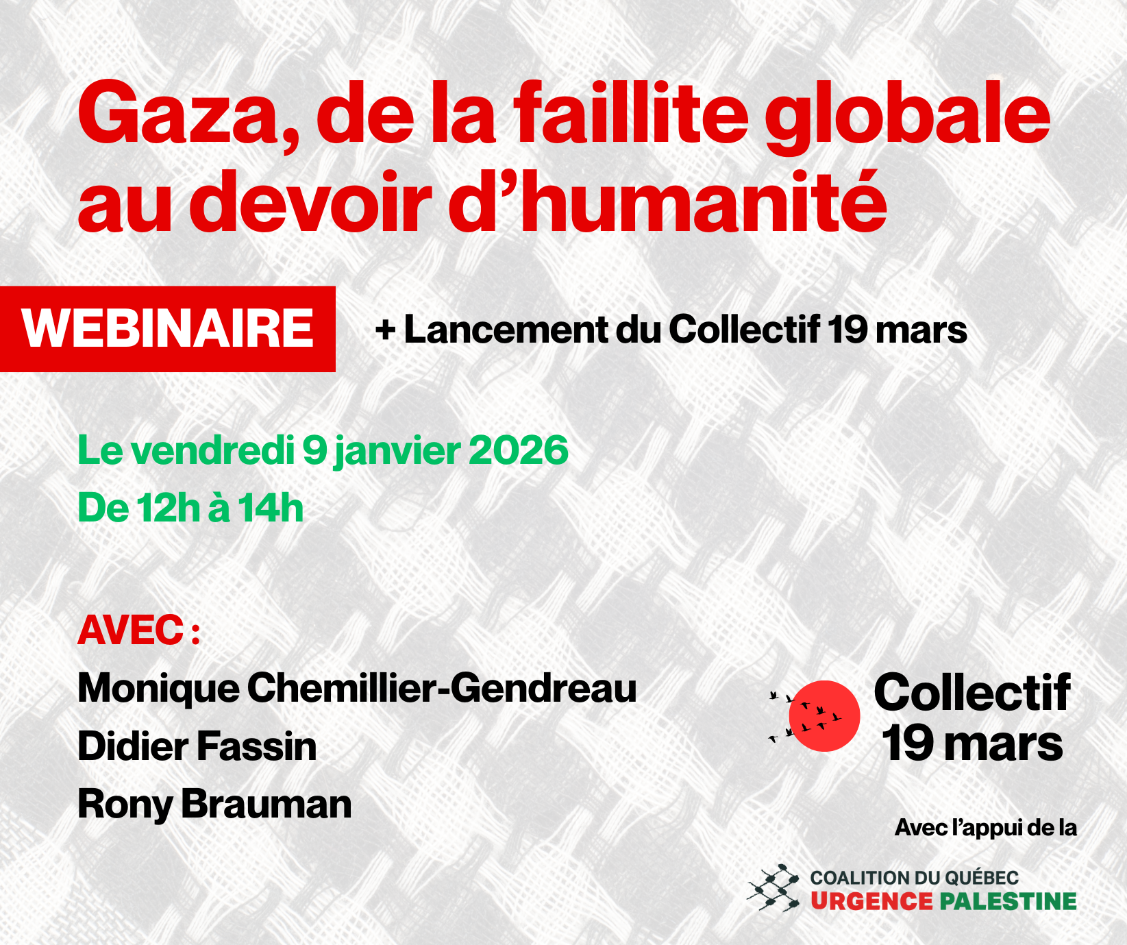 - 12 novembre 2025 : Participation de quelques membres du Groupe de travail du Collectif à l'Assemblée générale de la Coalition du Québec URGENCE Palestine.