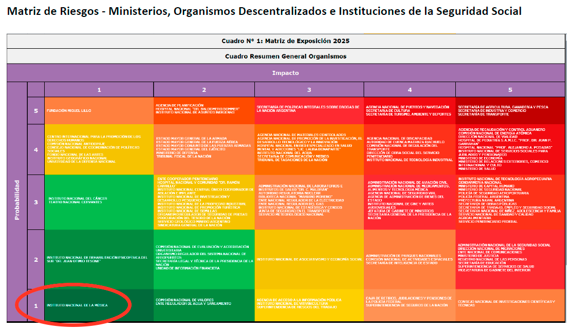En el marco de este encuentro, se destacó especialmente el resultado alcanzado por el INAMU en el Mapa de Riesgos del Sector Público Nacional, elaborado por la Sindicatura General de la Nación. Por segundo año consecutivo, el Instituto fue ubicado en el nivel más favorable de esta herramienta oficial que permite identificar y prevenir riesgos estratégicos, operativos y de integridad en los organismos del Estado.