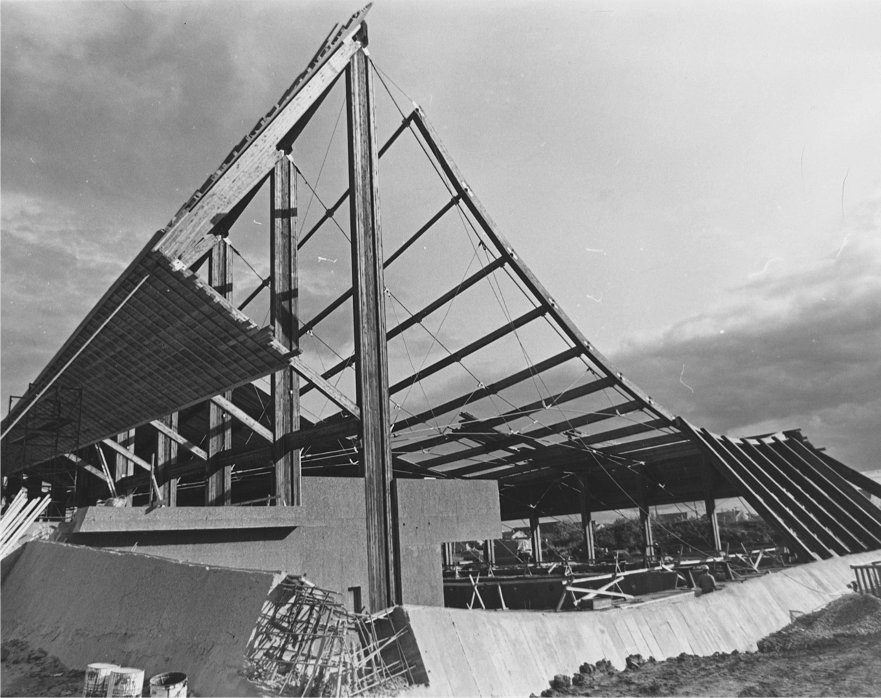 The pool building is designed in the Expressionist style of modern architecture. Its dramatic, sweeping roofline, reminiscent of a tent structure over the pool, reflects the transition from the Rocky Mountains to the prairies’ foothills and flatlands. The roof is clad in copper, and the interior structure is supported by a suspension cable system anchored to eight large concrete pillars on the north and south sides of the building.