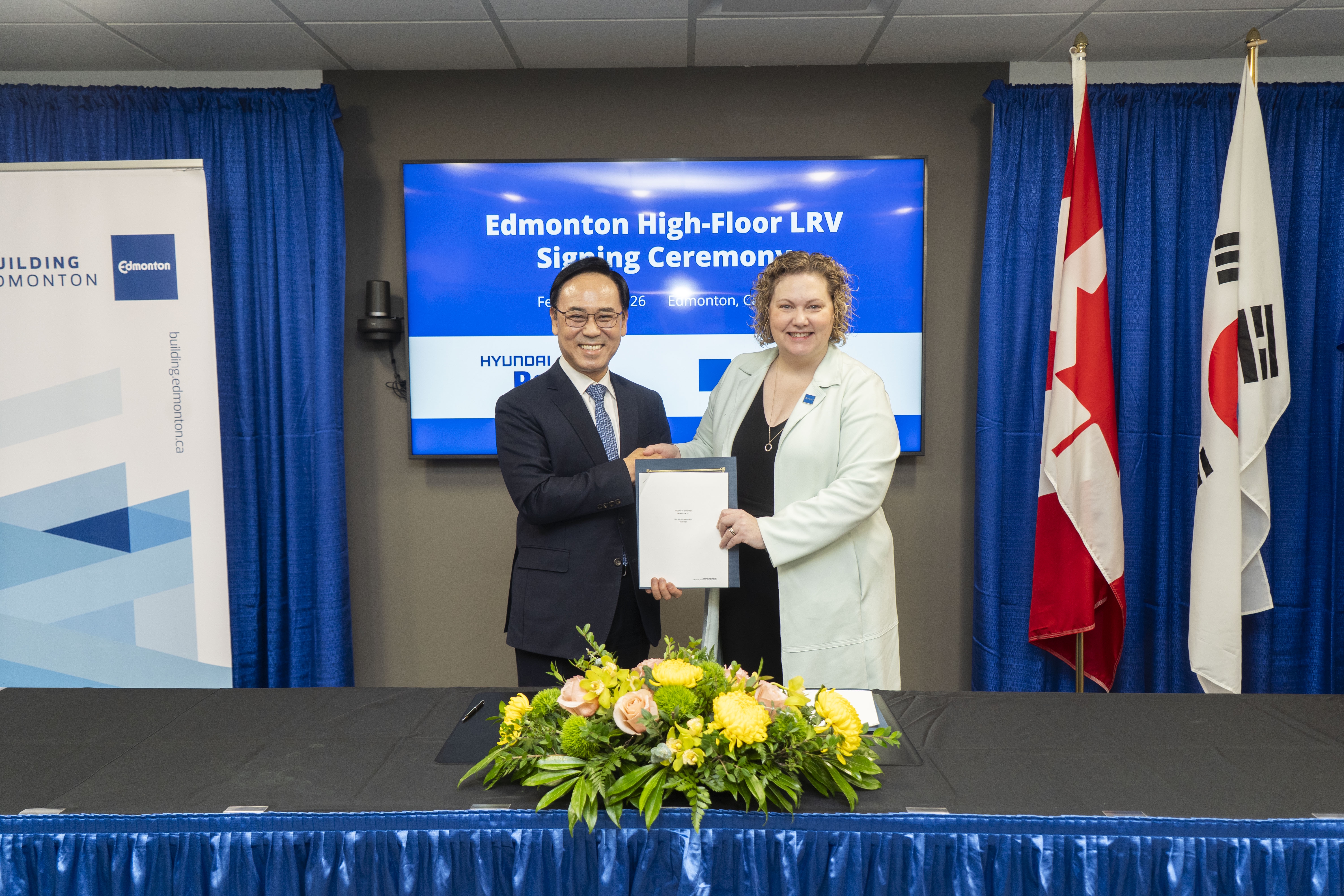 Based on technical and financial evaluation scores, the contract has been awarded to Hyundai Rotem Company (HRC). Representatives from the City and HRC signed the contract this morning in Edmonton. Design and manufacturing of 32 vehicles is expected to begin later this year, with delivery anticipated in 2029 and 2030.
