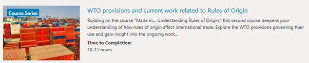 Take your knowledge further with WTO provisions and current work related to Rules of Origin (RoO). Learn how RoO affect international trade, review the WTO rules that govern them, and get an introduction to the work of the Committee on Rules of Origin. |