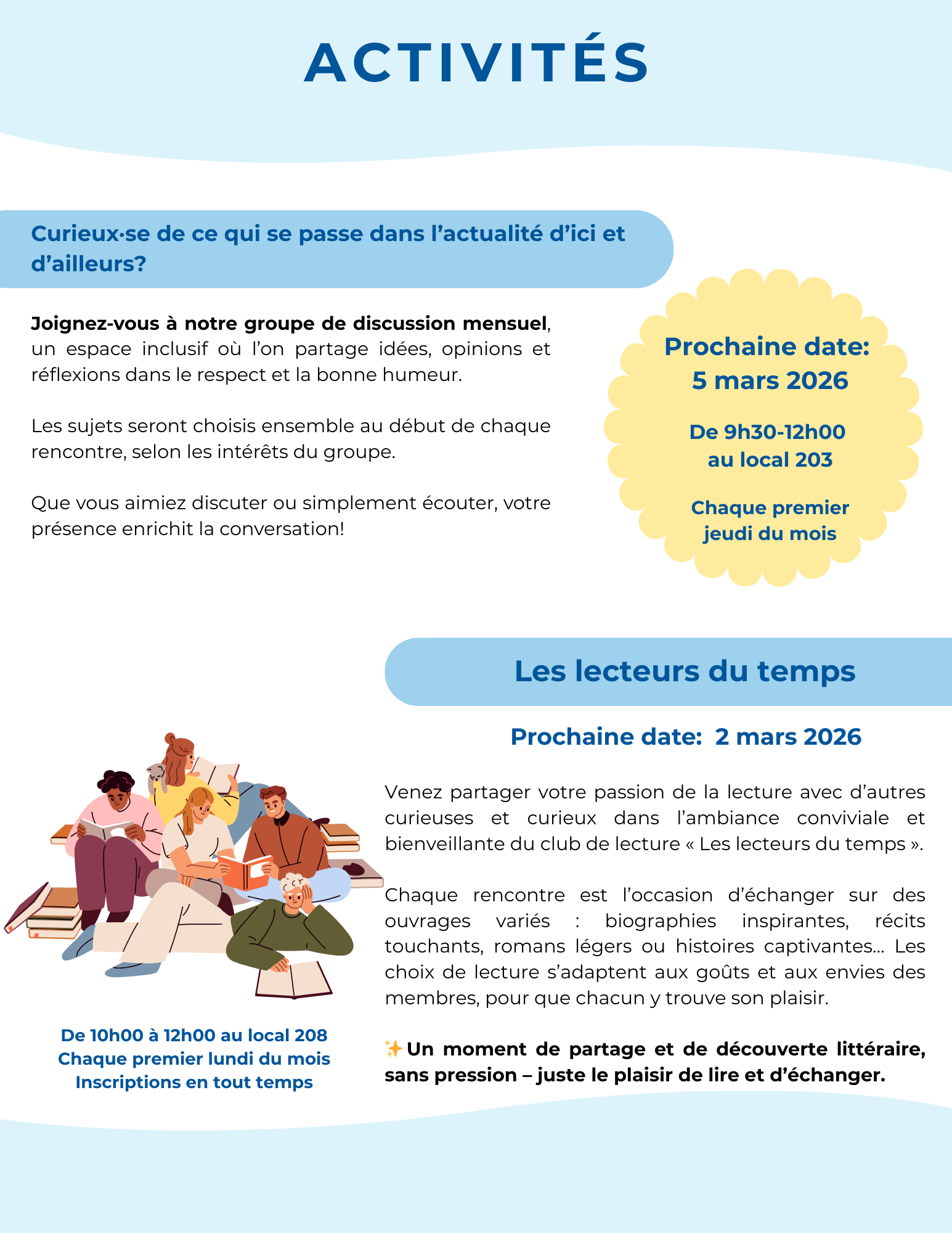 Activités: Groupe de discussion et d'échanges sur l'actualité & Les lecteurs du temps