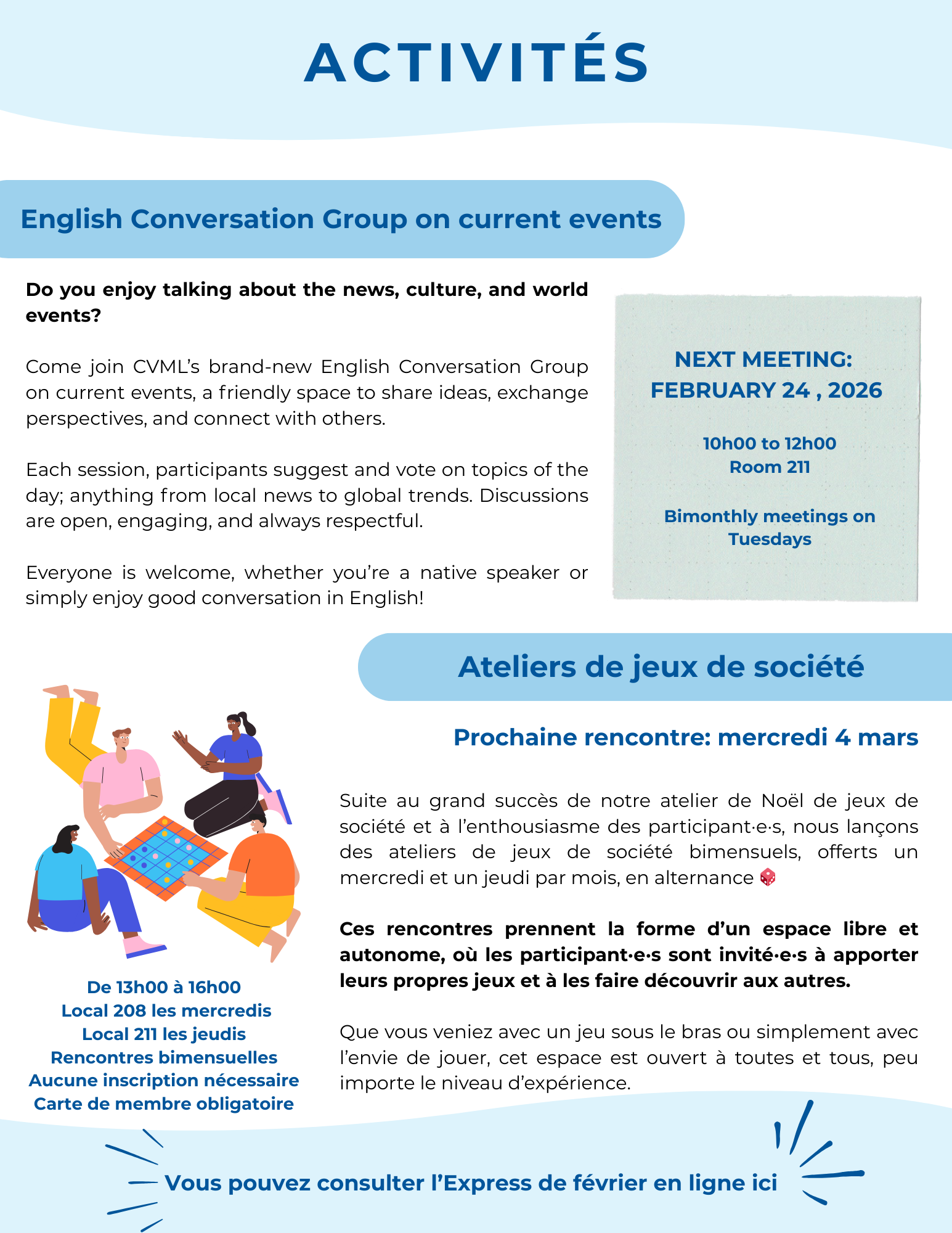 Activités: English Conversation Group on current events & ateliers jeux de société