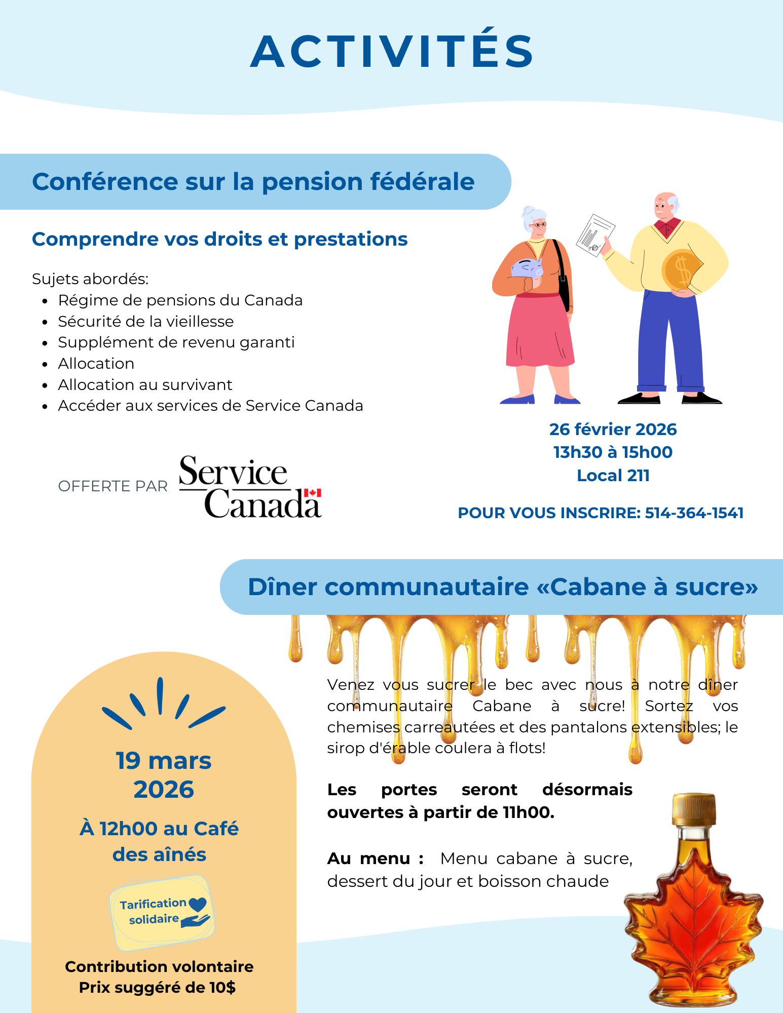Activités: Conférence sur la pension fédérale et dîner communautaire de mars