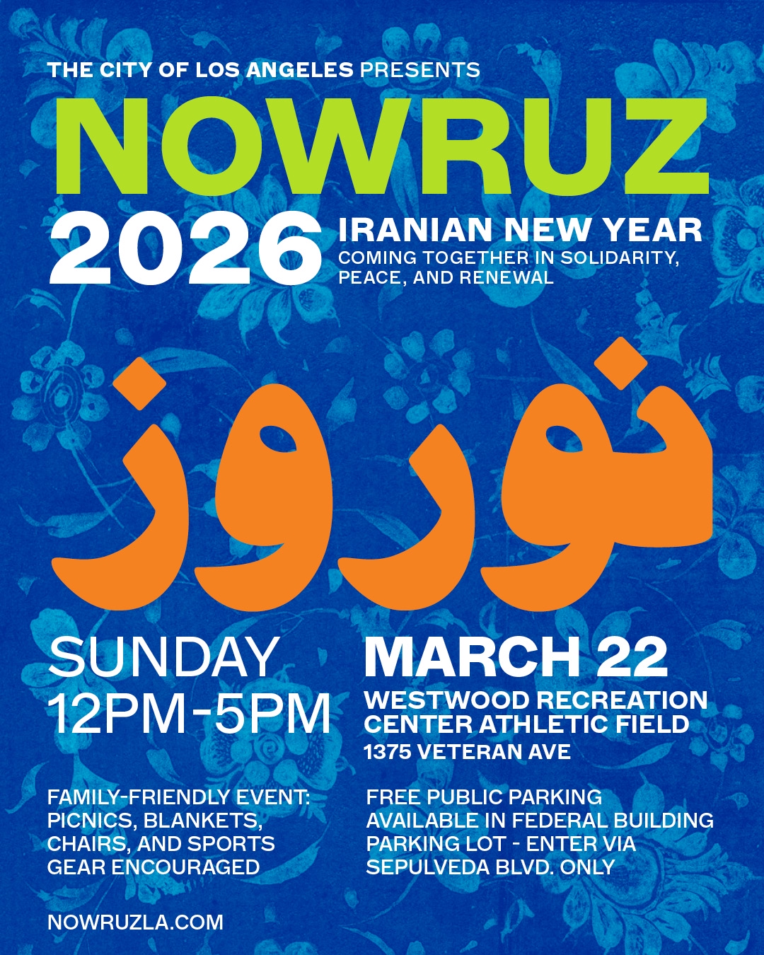 Join the City of Los Angeles on March 22 at Westwood Recreation Center for Nowruz 2026, honoring the Iranian New Year and the generations of tradition it carries forward. Celebrated by over 300 million people worldwide, Nowruz marks renewal and the turning of the season.