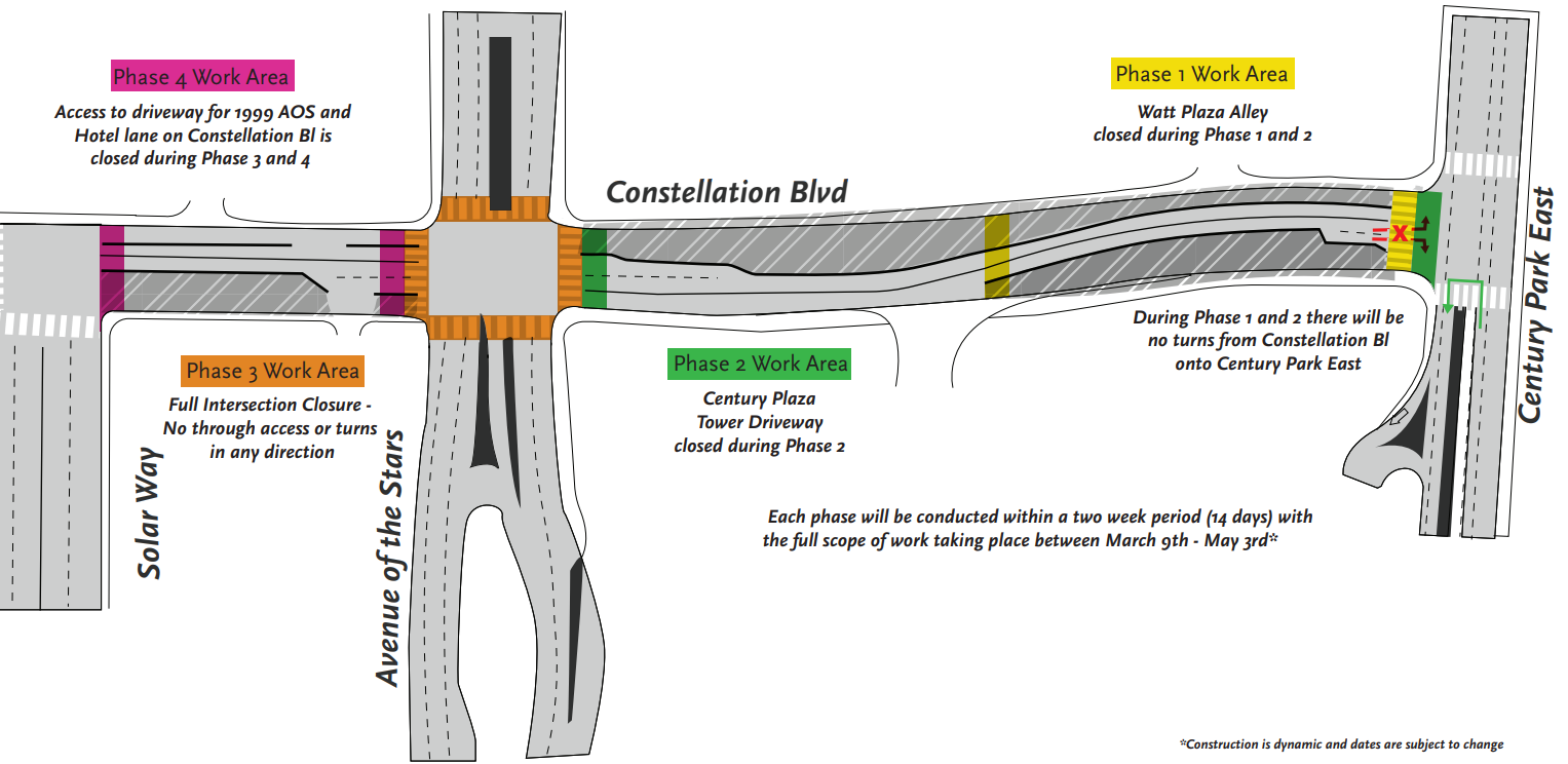 Phase One: Work will be conducted from the east end of Constellation Boulevard at Century Park East, up to the Century Park Tower driveway. Watt Plaza alley will be closed. The Century Park Tower driveway access will be maintained from Avenue of the Stars.