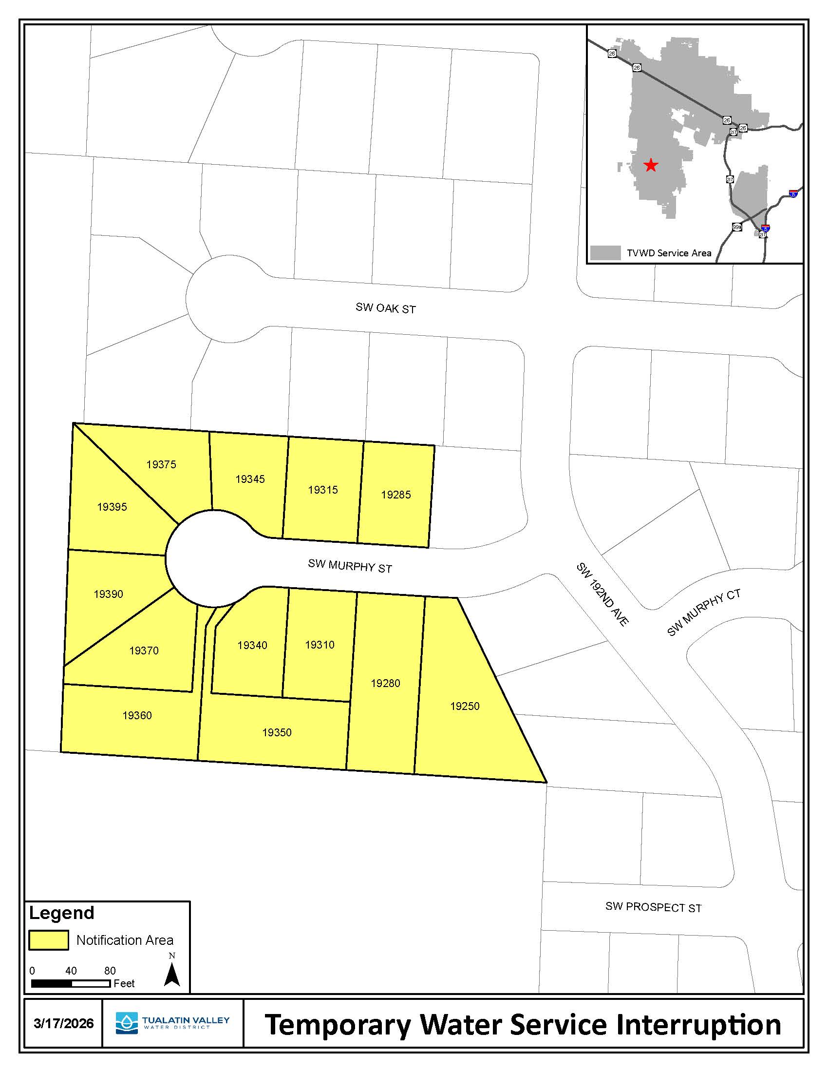 This shutoff will allow Tualatin Valley Water District (TVWD), your drinking water provider, to complete planned water system maintenance to the water main under the SW Murphy Street cul-de-sac west of SW 192nd Avenue.