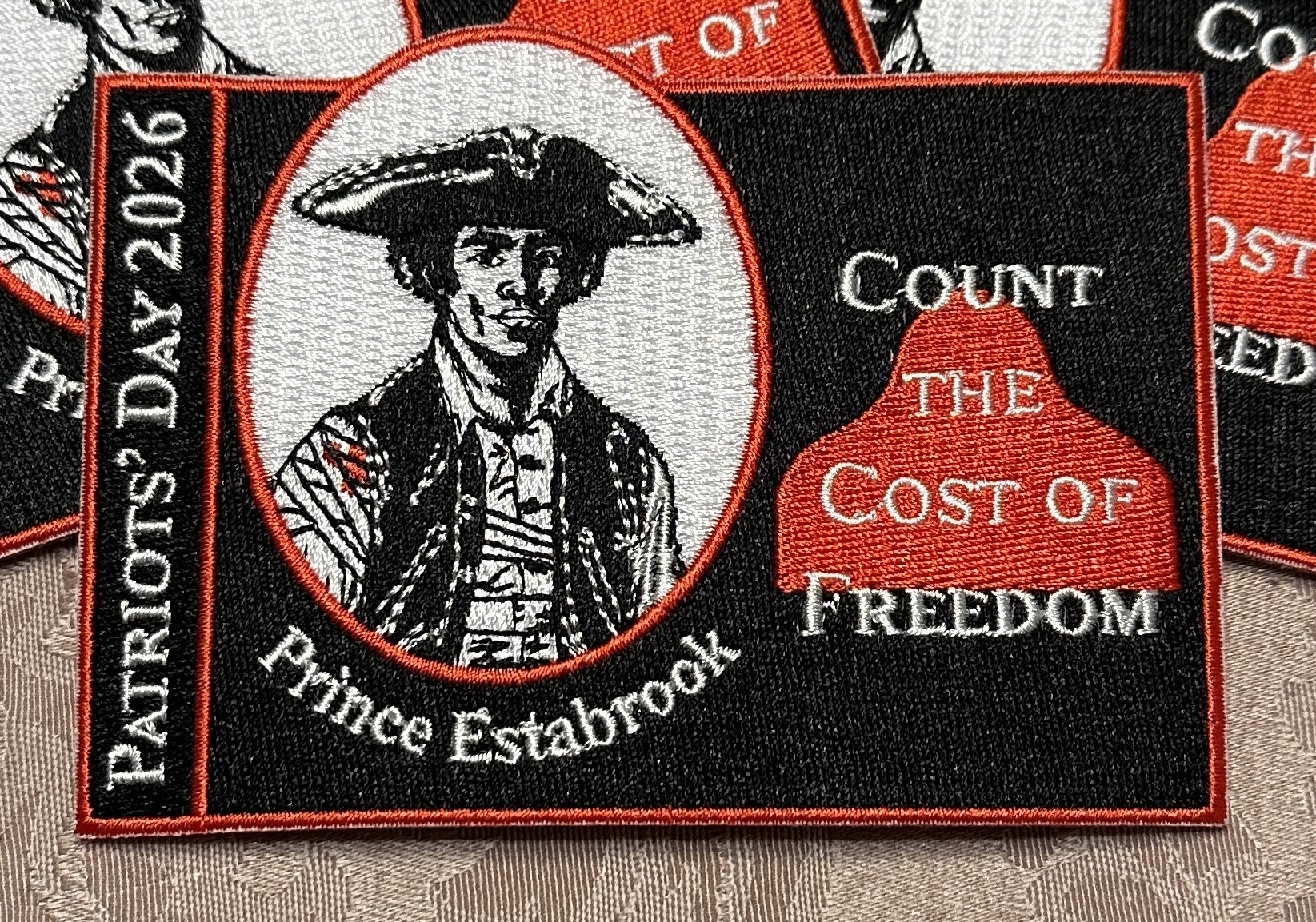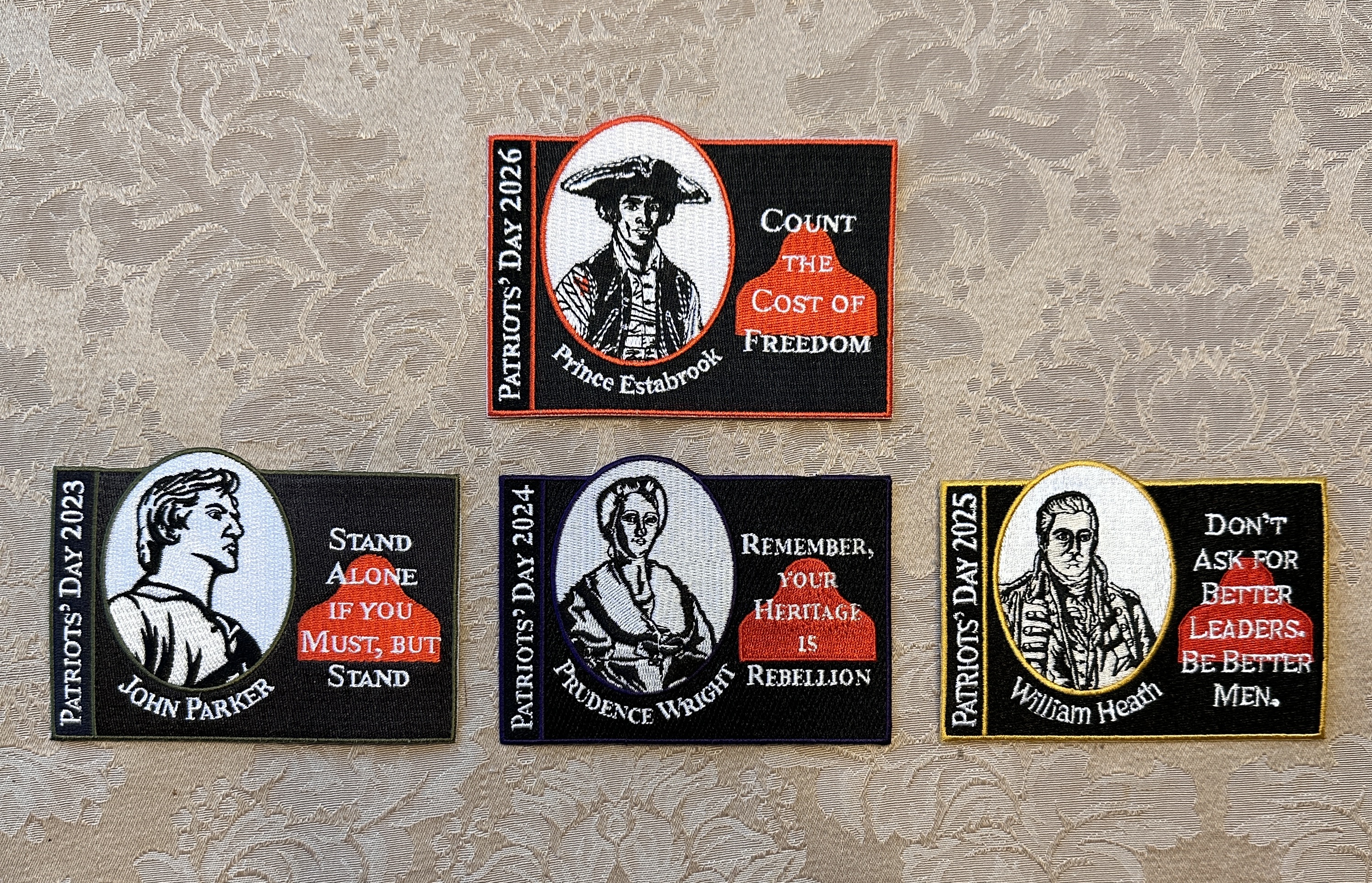 Come hear the story of Prince Estabrook at one of our April 19th Patriot's Day events. He stood with Captain John Parker on Lexington Green and served through the rest of the Revolutionary War. This patch and tee-shirt continue our 5-year series "We Are Descended From Dangerous Men." Previous years honored John Parker, Prudence Wright, and William Heath. |