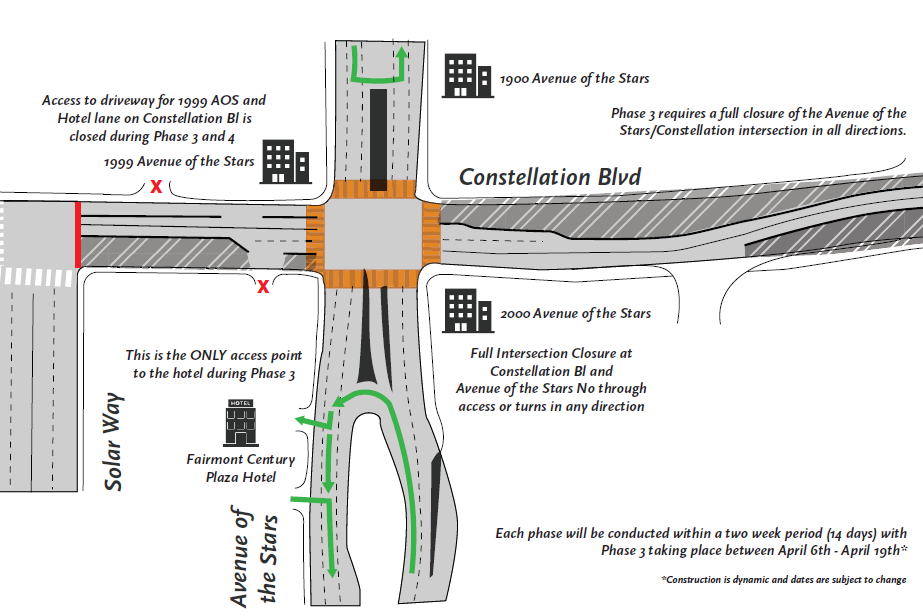 Construction on Phase 3 of deck removal will take place from April 6 through April 19. During this time, the intersection of Constellation Boulevard and Avenue of the Stars will be fully closed, with no through access or turns in any direction. Constellation Boulevard will also be closed east of Solar Way.