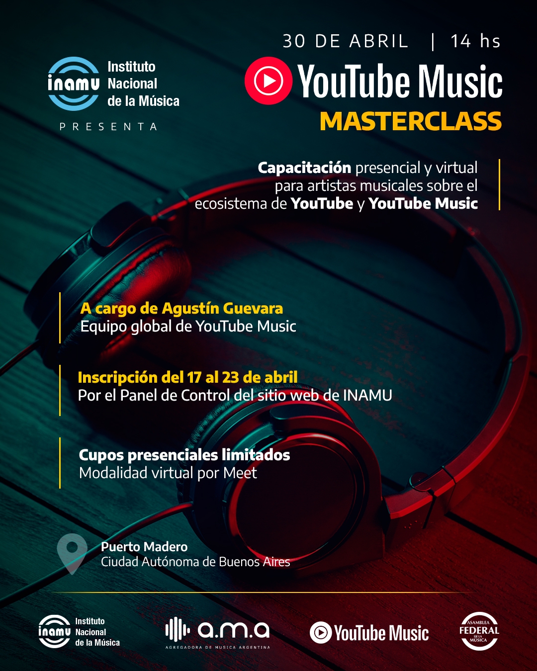 La actividad se realizará el 30 de abril a las 14 hs. y contará con dos modalidades de participación: presencial en Puerto Madero, Ciudad Autónoma de Buenos Aires, con 50 cupos, y virtual a través de Google Meet, sin límite de asistentes, para facilitar la participación de artistas musicales de todo el país.