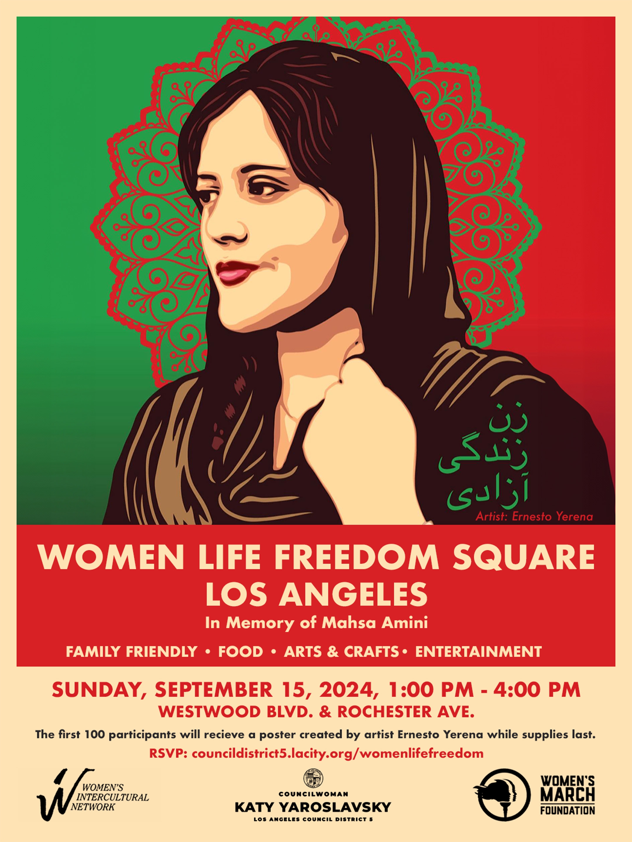 We are honored to invite you to the official unveiling of Women Life Freedom Square, in memory of Mahsa Amini. This important event, made possible through a collaboration between our office, the West LA Chamber of Commerce, the Women's Intercultural Network, and the Women’s March Foundation, will commemorate the life and legacy of Mahsa Amini and celebrate the resilience of women worldwide.